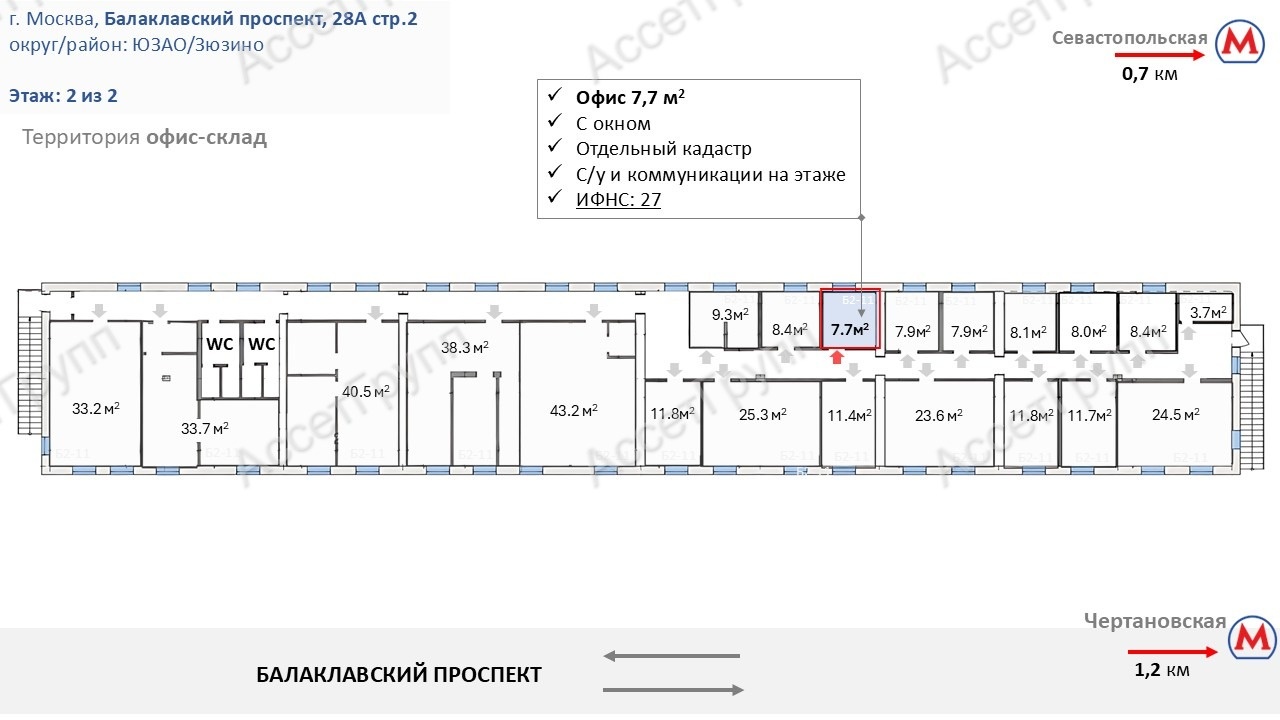 Транспорт: отличная локация с выездом Профсоюзную, Ленинский проспект, Варшавское и Каширское шоссе. Равное расстояние до ТТК и МКАД - удобная логистика для разных сфер бизнеса.