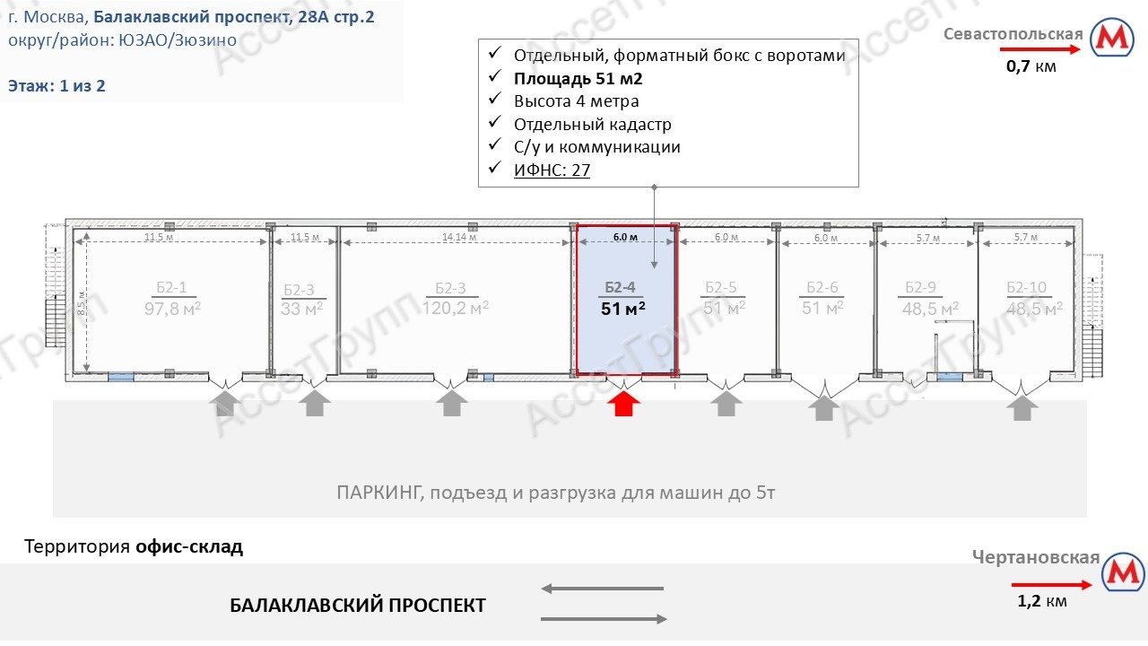 Транспорт: отличная локация с выездом Профсоюзную, Ленинский проспект, Варшавское и Каширское шоссе. Равное расстояние до ТТК и МКАД - удобная логистика для разных сфер бизнеса.